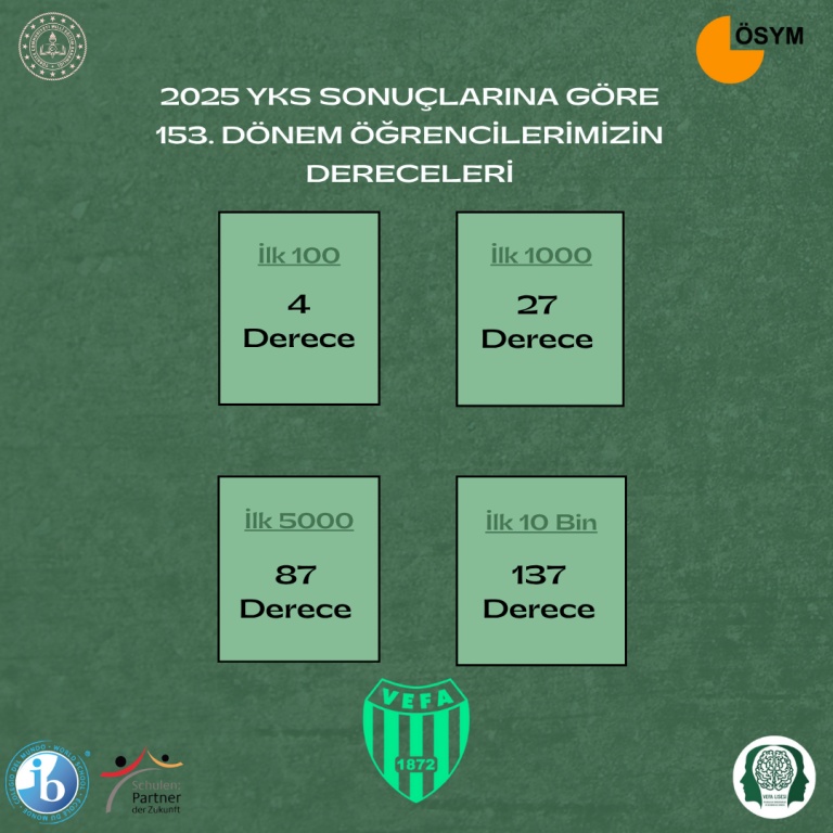 Vefa Lisesi geleneğiyle sınava hazırlanan 153.Dönem öğrencilerimizi 2025 Yükseköğretim Kurumları Sınavı (YKS)'nda göstermiş olduğu üstün başarılarından dolayı tebrik eder, emeği geçen tüm kıymetli öğretmenlerimize, öğrencilerine verdiği destekleriyle başarılarını taçlandıran değerli velilerimize ve tüm Vefa Lisesi paydaşlarına teşekkür ederiz.